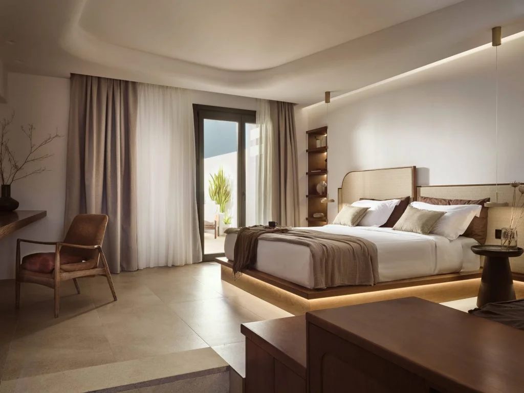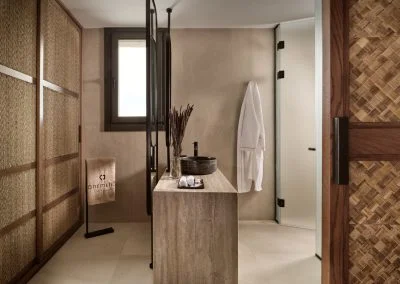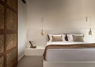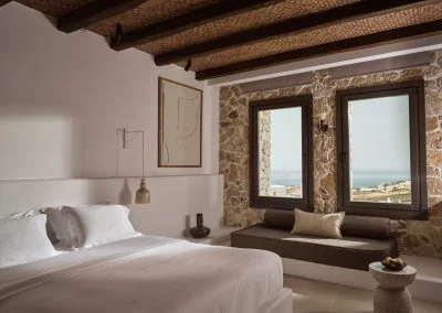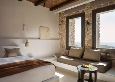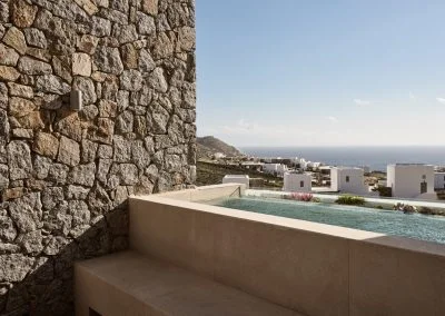 Με αναφορές στην παραδοσιακή κυκλαδίτικη αρχιτεκτονική, η Design Sea View Suites upper floor with Private Pool συνδυάζει την απλότητα με τη σύγχρονη πολυτέλεια, δημιουργώντας μια χαλαρωτική και άνετη ατμόσφαιρα. Οι σχεδιαστικές λεπτομέρειες, τα φυσικά υλικά και η υπέροχη θέα στη θάλασσα προσφέρουν μια μοναδική εμπειρία φιλοξενίας.